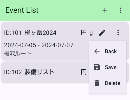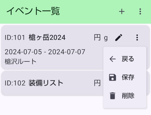 - イベントメニューから「保存」と「削除」ができます。