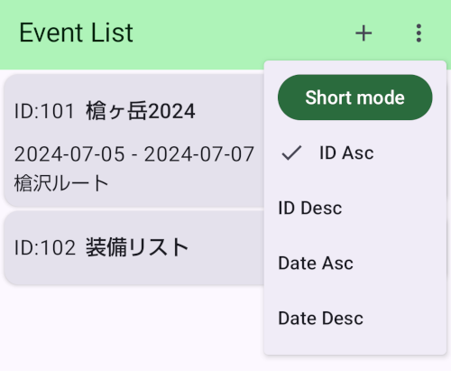- トップバーには戻るの矢印アイコンと、イベント名、「+」の追加アイコン、虫眼鏡の検索アイコン、とメニューアイコンが有ります。