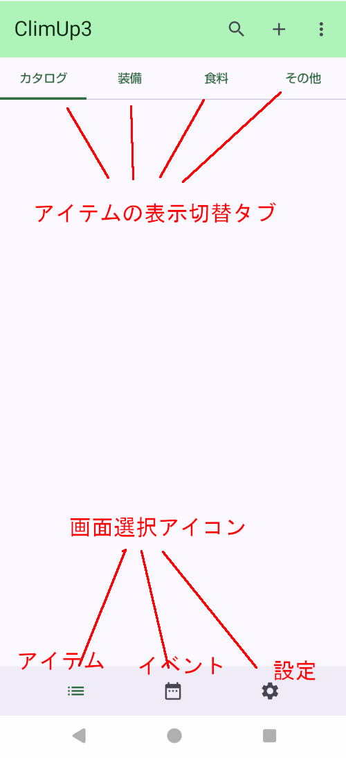 - 画面下部にある「アイテムリスト」「イベントリスト」「設定」アイコンでそれぞれの画面へ切り替えられます。