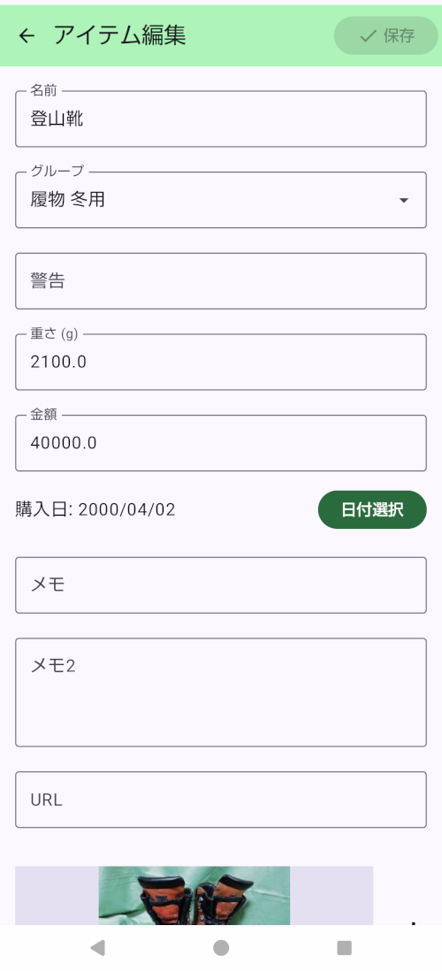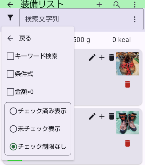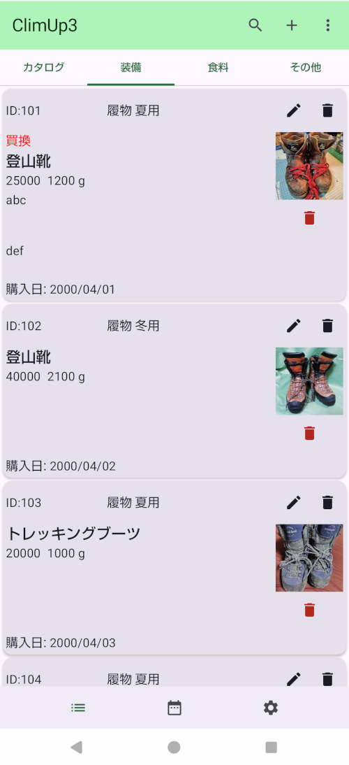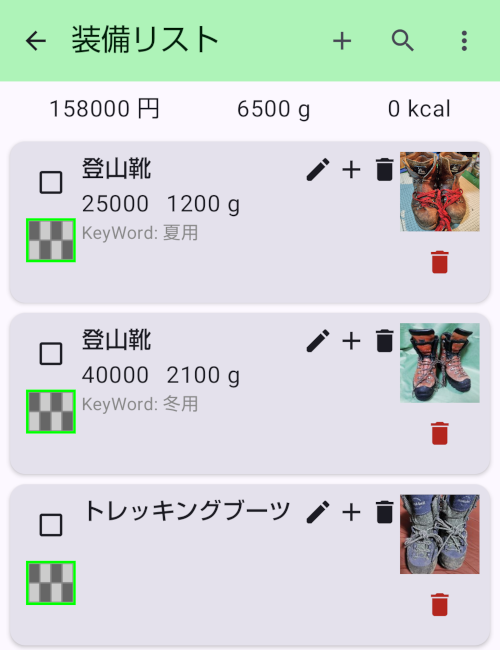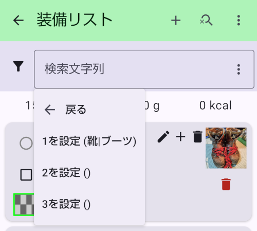 - 装備には「警告」(赤字)が設定できます。故障していたり、古くなっていたりしたら、警告を設定しておくと事前に気づいて対応ができます。