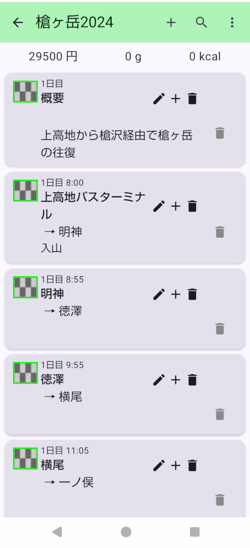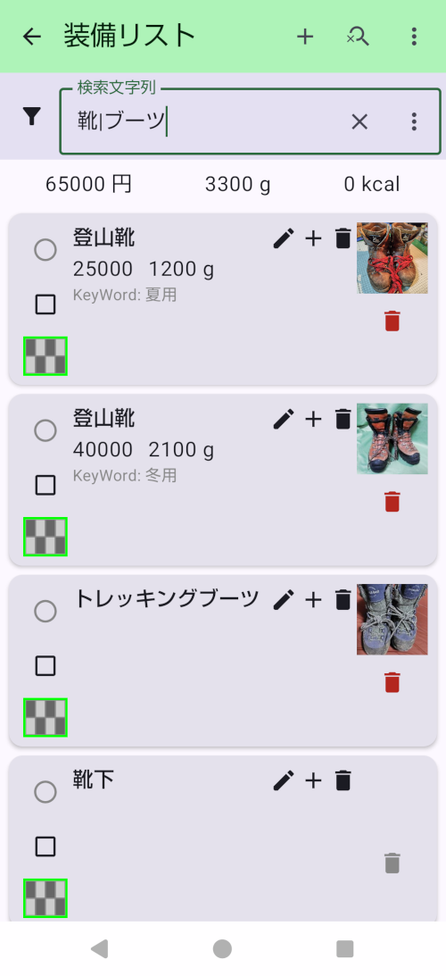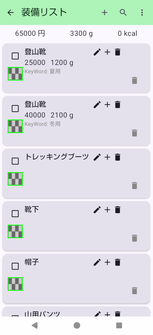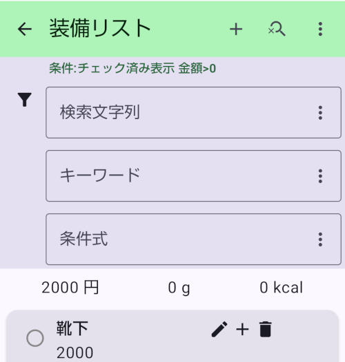 - カード表示の上に、集計表示が有ります。ここにはリレーションに設定されている「金額」「重さ」「Kcal」の合計値が表示されます。検索機能が有効なときには検索結果の合計値です。